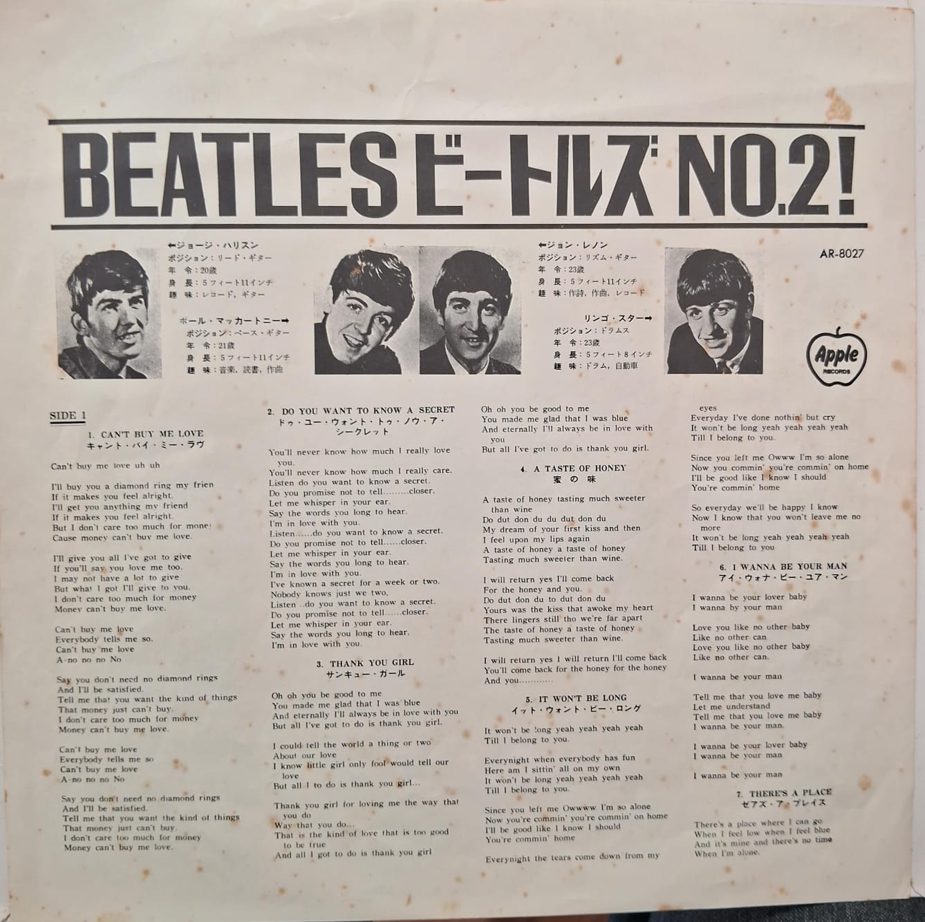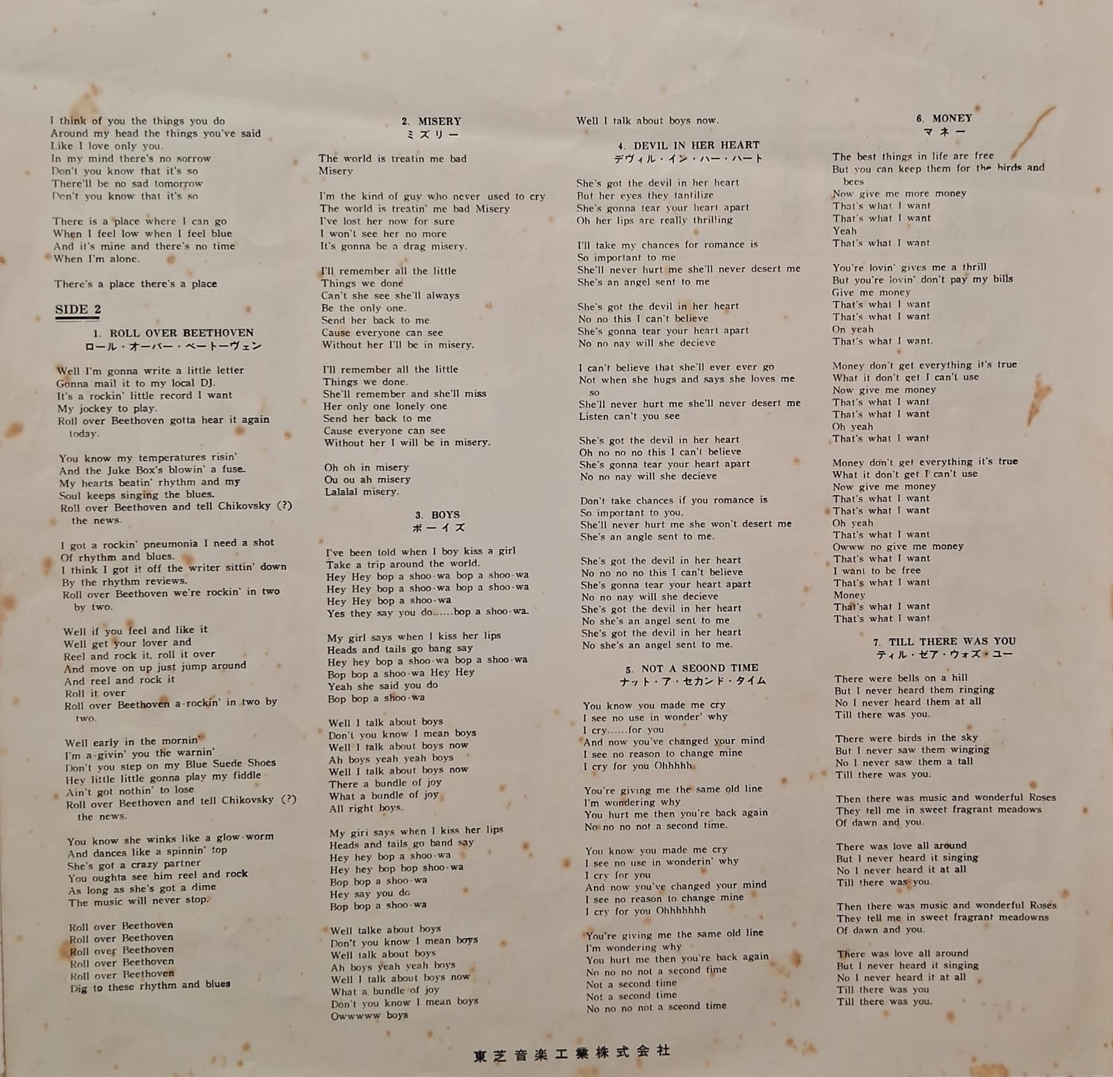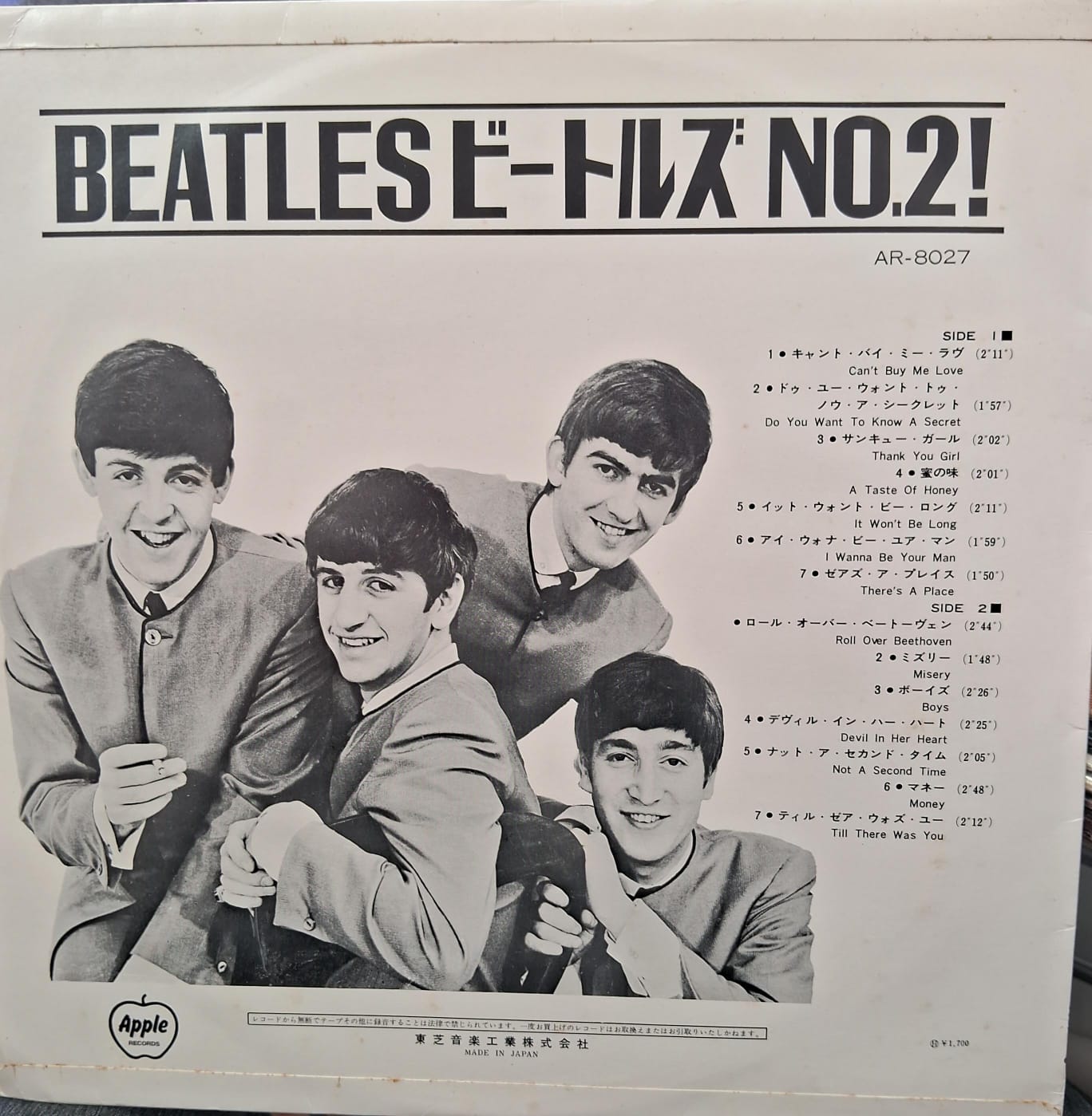 Japan only 14 track Mono LP. Includes English lyric insert. Beatles "Forever"