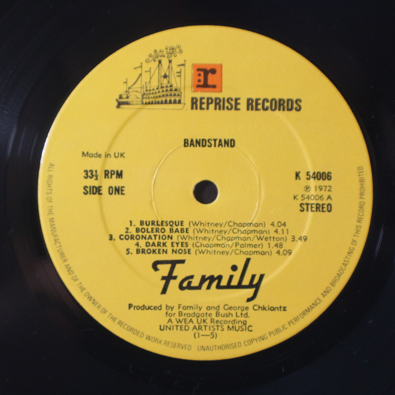 Produced by Family and George Chkiantz for Bradgate Bush Ltd. A WEA UK recording.