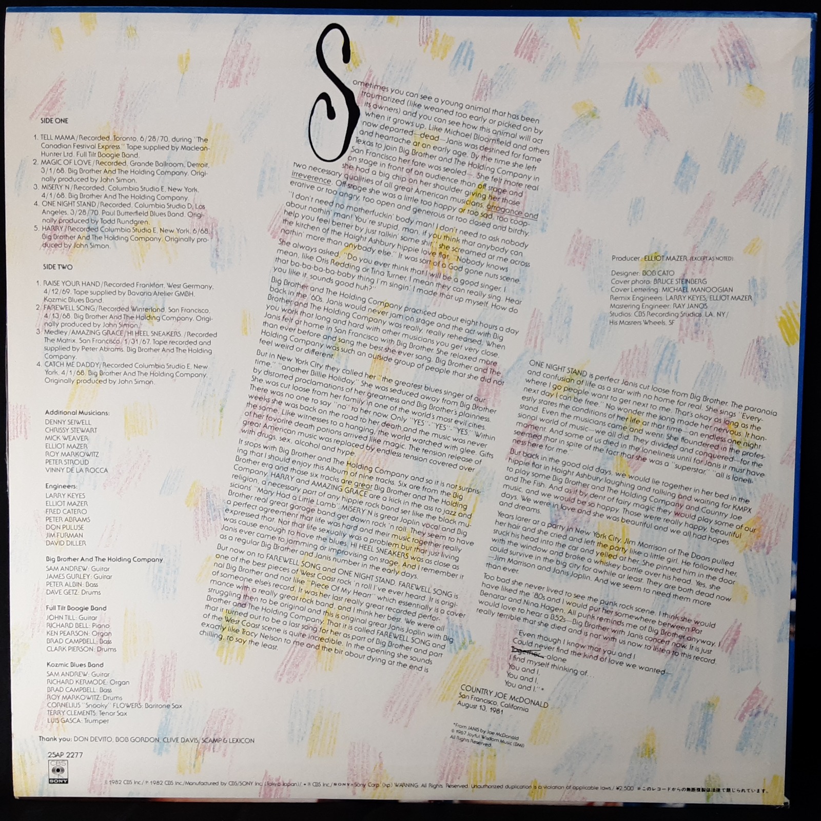 | B4 | Catch Me DaddyBass – Peter AlbinDrums – Dave GetzGuitar – James Gurley, Sam AndrewProducer – John SimonWritten-By – D. Getz*, J. Gurley*, J. Joplin*, P. Albin*, S. Andrew*Bass – Peter AlbinDrums – Dave GetzGuitar – James Gurley, Sam AndrewProducer – John SimonWritten-By – D. Getz*, J. Gurley*, J. Joplin*, P. Albin*, S. Andrew* | 4:50 |