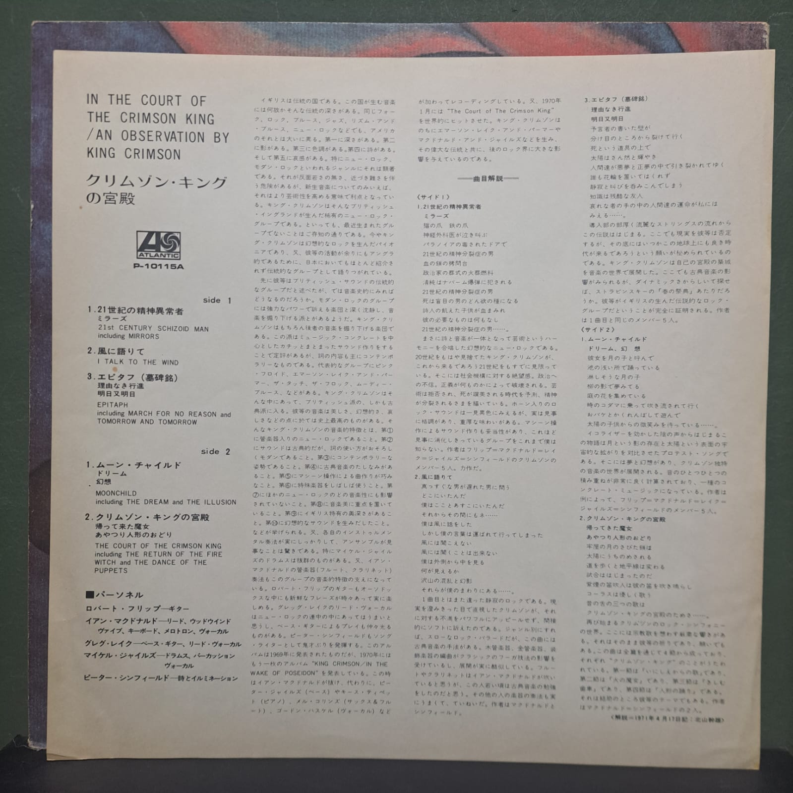| A2 | I Talk To The Wind = 風に語りてWritten-By – McDonald*, Sinfield* | 6:08 | |